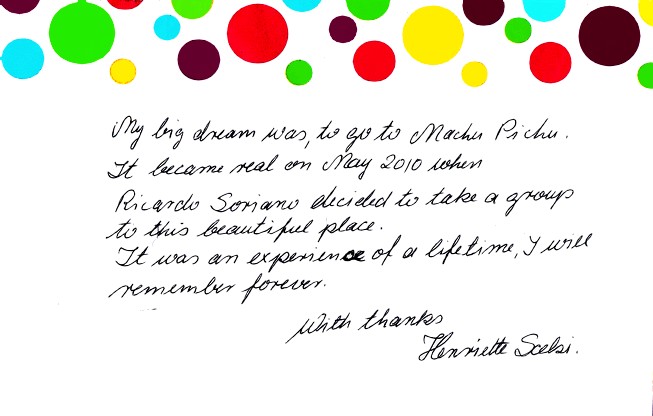 Thank you for a wonderful Peru experience. It is something I shall never forget; the beauty of the country and the people. Although we had an itinerary, you always fully explained about the "Tour of the Day" the night before and/or what hotel we would be staying at the following day. You were there for us from morning to night and were especially attentive to our personal safety and health. While traveling to our destination for the day, it was great to hear the stories about the Ancient peoples, their cultures, and stuggles from you. Before the end of the trip everyone on the tour had become a family and we continue to be in touch. Thank you again for the beautiful memories and pictures I have of a marvelous trip by a SUPER TOUR GUIDE. "